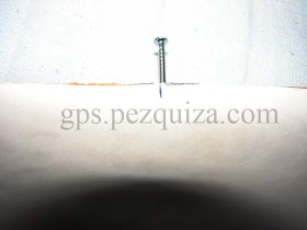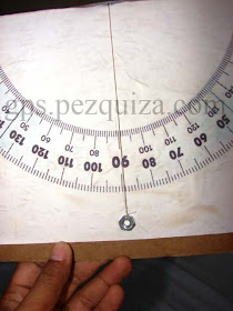Inclinômetro pronto, já com o pêndulo colocado, note que a linha tem passar pelo meio exato do transferidor para que ele marque o valor de elevação com precisão.